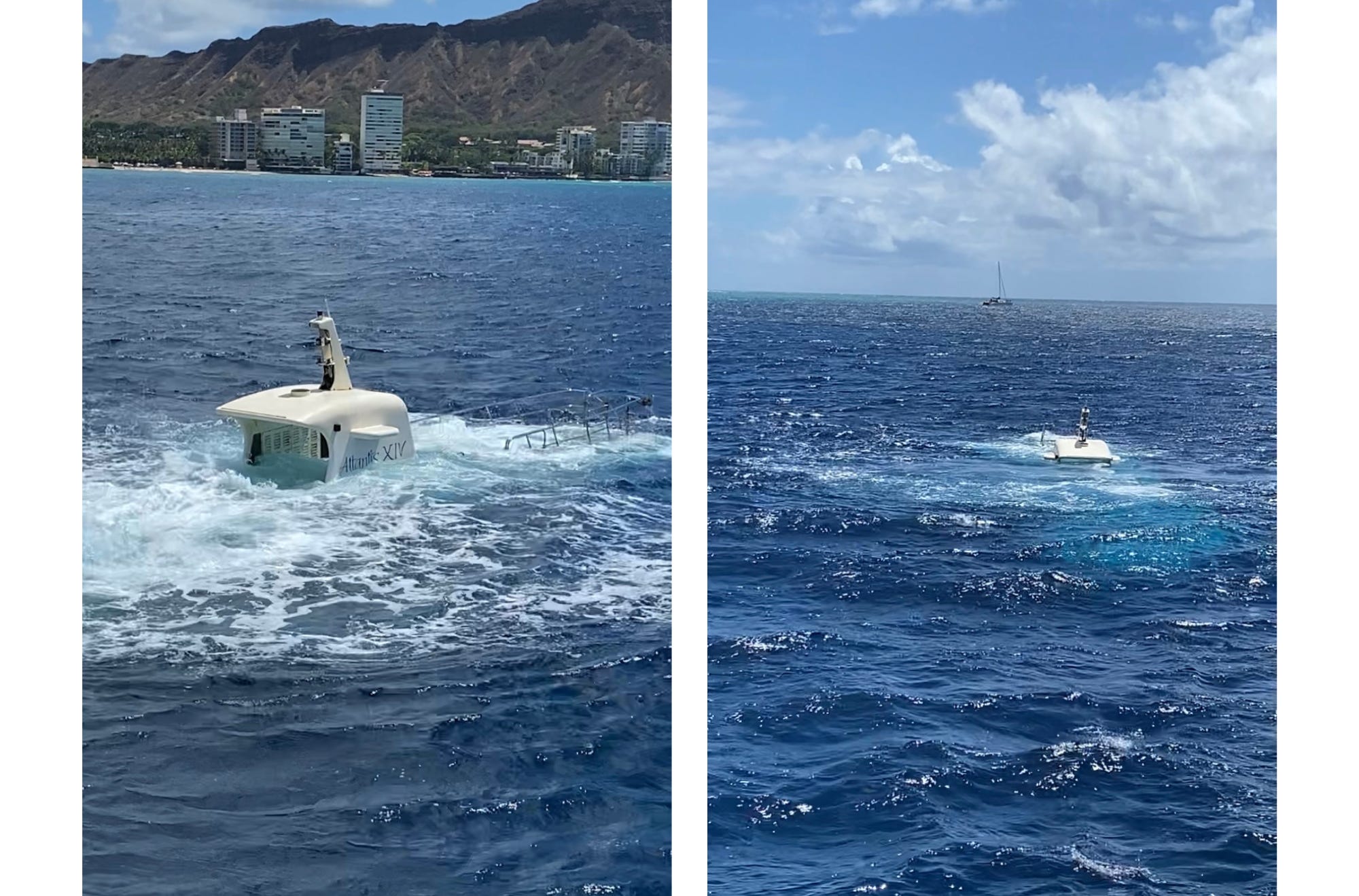 When the shuttle boat finally arrived, my Dad said hello to some fellow co-workers onboard and we took a seat up at the top so we could catch the cool breeze in the hot sun. We chatted with one of the Captains for a moment, enjoyed the scenic views, and then caught the surfacing of the submarine we were about to embark on.